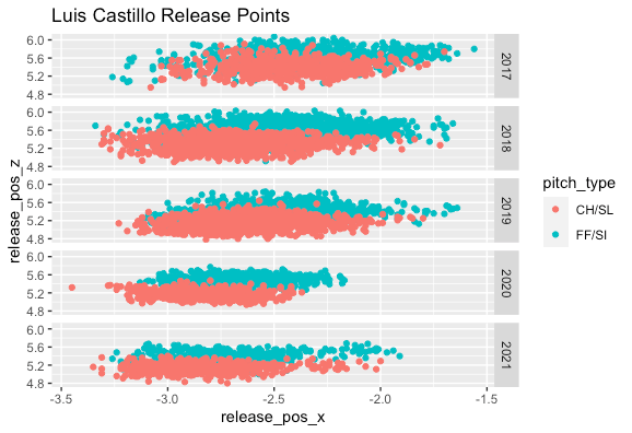 I believe Castillo’s biggest flaw is the huge discrepancy in release point between his fastballs and secondary pitches.